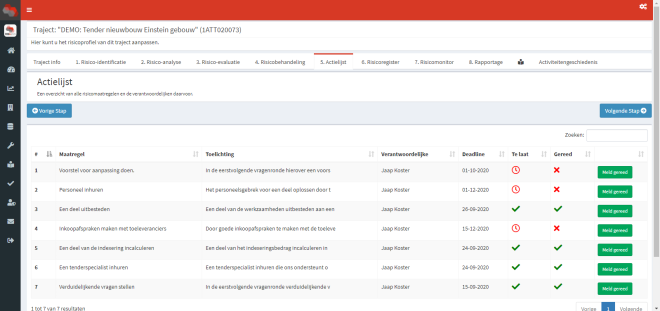 Om goed overzicht te houden op alle lopende risicobeheersingsprocedures in uw organisatie kunt u deze met de Risicomonitor en het Trajectendashboard voortdurend blijven volgen.